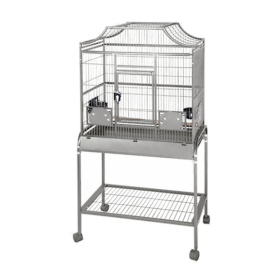 A&E Cage Elegant Flight Cage 28inx18in Platinum comes with 1/2in bar spacing, horizontal side bars, and vertical bars front and back. Includes bird proof front door and feeder door locks, front door safety latch. 4 swing out feeder doors, 4 stainless steel feeder cups and 1 perch, large front for easy access, slide-out grill and tray for easy cleaning. This cage is made with a non-toxic, durable and safe powder coated finish. It also includes a bottom shelf for storage. This flight cage is best suited for Lovebirds, Cockatiels, Parakeets, Conures, and Lorries.