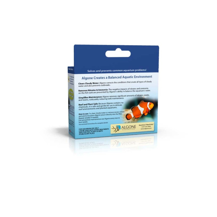 ALGONE Water Clarifier and Nitrate Remover A lgone addresses issues most commonly associated with deteriorating water quality and accumulating waste, pollutants, and toxins. High pollutants cause stress on the tanks inhabitants, weakens their immune system and ultimately makes fish vulnerable toward diseases. Pollutants are also the primary cause of deterioration of the tanks appearance. Delicate reef and saltwater aquariums are also severely threatened bu degrading conditions. While the accumulation of waste is inevitable in freshwaterm reef and saltwater aquariums alike, detrimental consequences are preventable. Nitrogen fixating microorganisms incorporate nitrogen into the cellular mass, while bioactive enzymes assimilate nitrogen from the water column. Algone is a non-toxic, chemical free aquarium water purifier, an essential part of maintaining a healthy aquatic environment for healthy fish. Enzymes break down protein, carbohydrates and metabolic waste into insoluble complex structures. Placement in any type of filter system is no problem. Simple drop-in-filter application. Use to correct nutrient imbalances & to clear cloudy water. Also use for preventive maintenance. Trace elements are protected from early precipitation increasing the bio availability for plants, corals, and other organisms. Algone does not contain chemicals and is safe to use in all aquatic environments. Product Features: Clears cloudy water and removes nitrates Prevents many common problems related to poor water quality Simple drop-in filter application, works with any filter type Use as problem solver and for preventative maintenance Non-toxic, 100% chemical-free and highly effective Naturally produces crystal clear water Sizes: Small Single Pack - for aquariums 1-125 gallons Large Single Pack - for aquariums 125 gallons and up