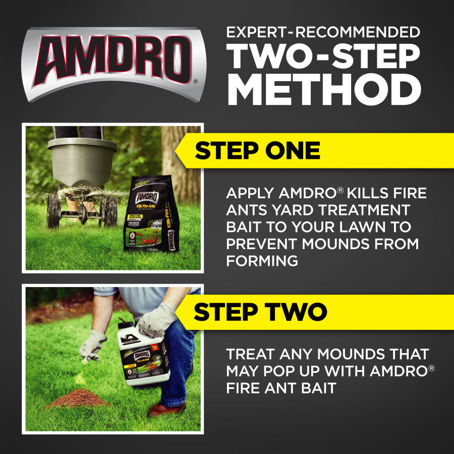Amdro Fire Ant Bait is the original fire ant killer. It kills visible and hidden fire ant mounds fast. Once you distribute a circle of bait around the mound, the worker fire ants carry it back to the colony to share it with the queen. After the queen eats it and dies, her colony dies with her. The granules are designed for individual mound treatment but can also be used for broadcast application in outdoor areas for total fire ant control. Amdro Fire Ant Bait kills fire ants, bigheaded ants, and harvester ants.