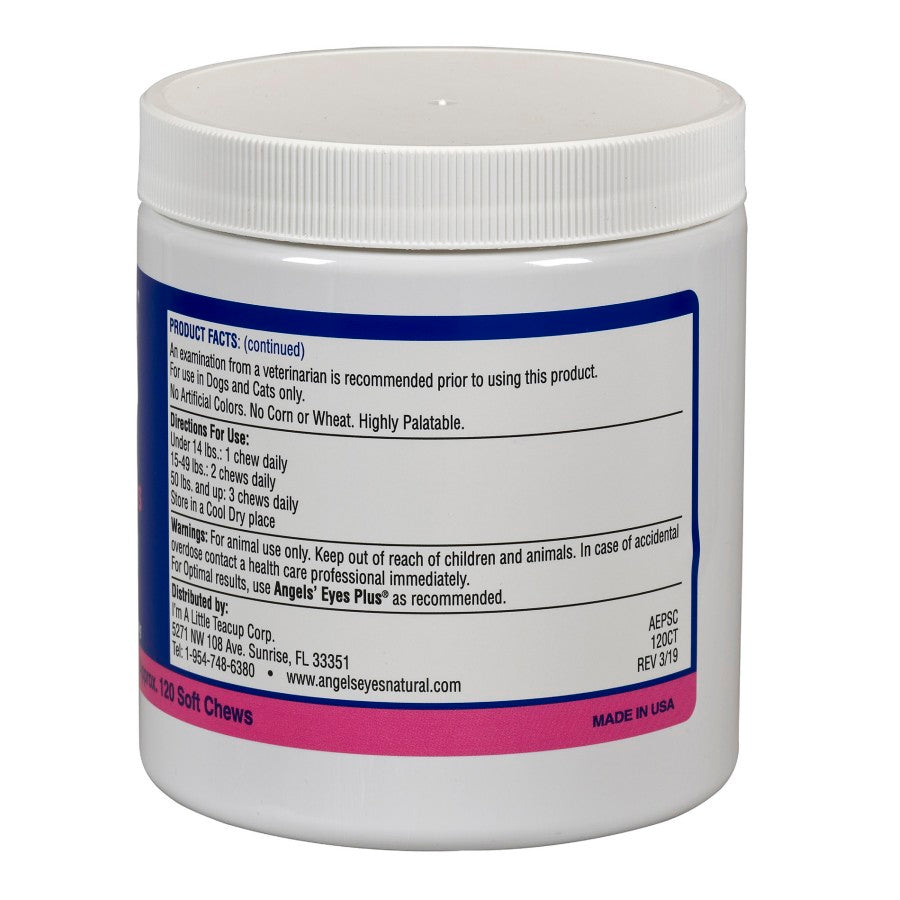 Angels' Eyes PLUS Soft Chew Beef Flavor 120 Ct Dog is a special all natural enhanced anti-tear stain formula specifically developed for both dogs and cats for unsightly tear stains from the inside out! Angels' Eyes PLUS Soft Chew Beef Flavor 120 Ct Dog is a proprietary blend composed of natural antioxidants and helps support the normal inflammatory response. Angels' Eyes PLUS Soft Chew Beef Flavor 120 Ct Dog never adds food dyes, wheat, corn, or soy which may have negative effects on your pet!