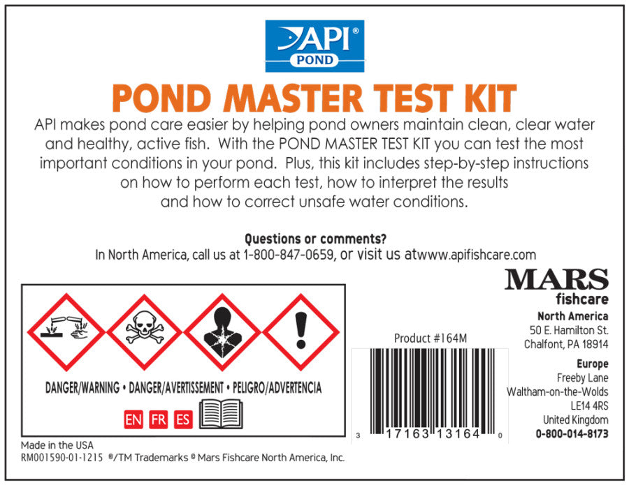 The API POND MASTER TEST KIT Pond Water Test Kit provides everything you need for regular testing of your pond water or even tap water. This complete pond test kit measures the most important levels, including pH, ammonia, nitrite and phosphate to maintain ideal water condition. Inside the kit you’ll find six bottles of liquid test solutions, several laminated color-matching charts, four glass test tubes with snap-tight caps, a holding tray and an easy-to-follow instruction booklet. Simply gather your samples, add the correct test solution and compare the color with the corresponding color chart to determine each level. This pond kit contains enough water testing supplies for over 500 tests. With API POND products, it’s easy to keep a beautiful pond. For almost 60 years API has developed premium solutions with proven and effective results for your family and ours. API offers a range of testing kits, water conditioners, and nutritionally superior food, because we’re dedicated to making a better underwater world. They work to provide a safe, hospitable environment for fish such as koi, catfish, perch, goldfish and more. At API, we understand the rewards and relaxation of fishkeeping because we have a passion for fish too.
