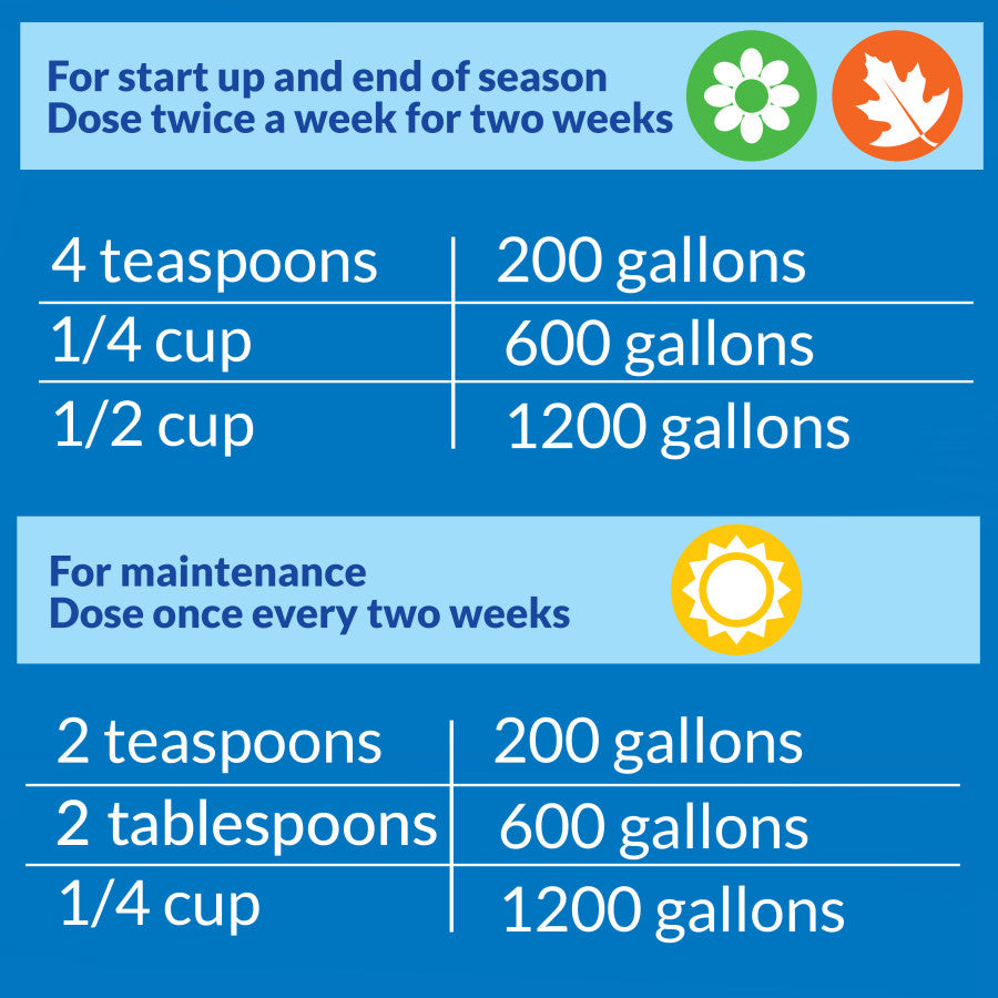 - Use Instructions: Initial dose at Spring start-up and end of season dose: add two scoops per 200 gallons of pond water twice a week for 2 weeks. Maintenance dose: add one scoop per 200 gallons every 2 weeks.