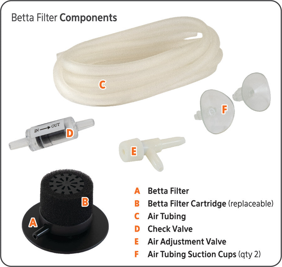 - Included: Betta filter with volcano, suction cup base, air tubing and suction cups, air adjustment valve, check valve, instructions