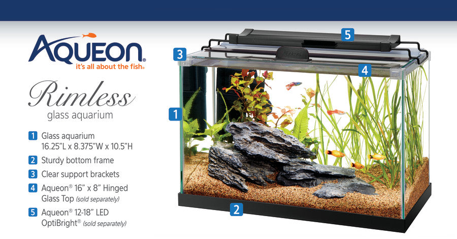 - Included: Glass aquarium and glass top support brackets (for use with Aqueon 16 x 8 glass top - sold separately)
