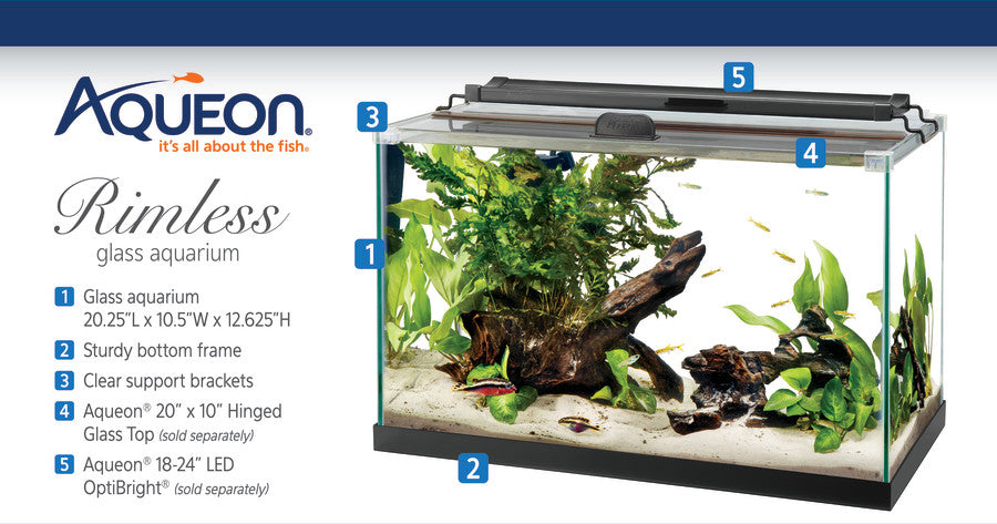 - Included: Glass aquarium and glass top support brackets (for use with Aqueon 20 x 10 glass top - sold separately)