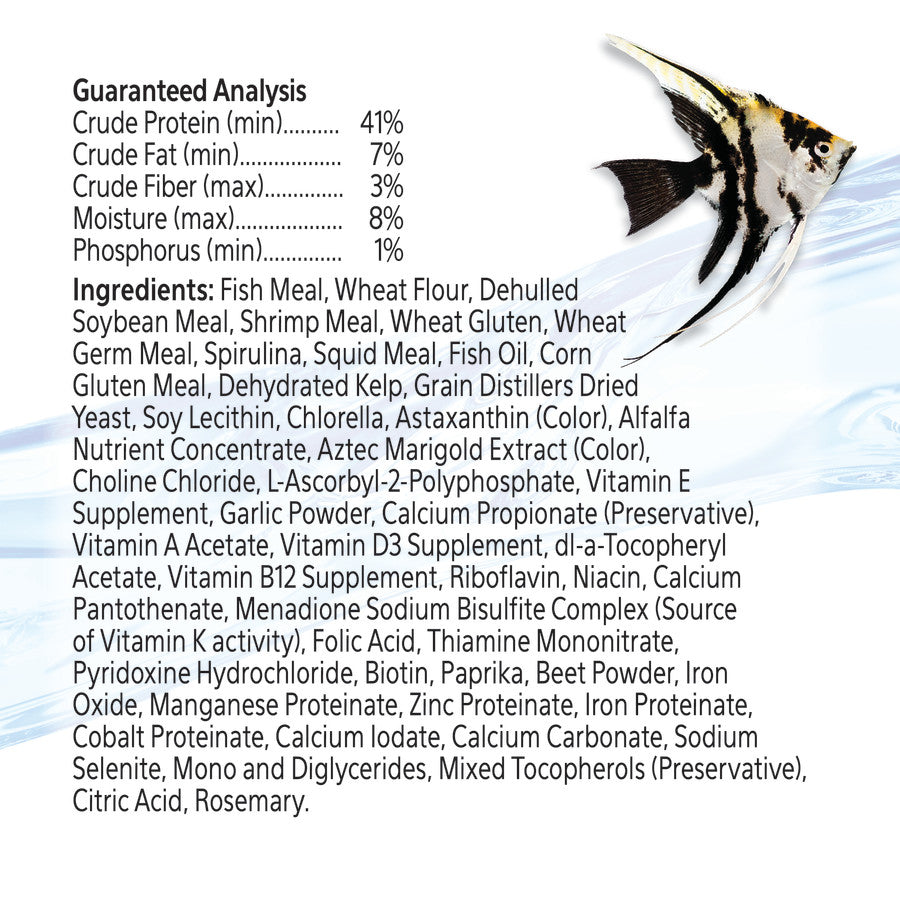 - Ingredients: Whole Fish Meal, Wheat Flour, Dehulled Soybean Meal, Shrimp Meal, Wheat Gluten, Wheat Germ Meal, Spirulina, Squid Meal, Fish Oil, Corn Gluten Meal, Dehydrated Kelp, Grain Distillers Dried Yeast, Soy Lecithin, Chlorella, Astaxanthin (Color), Alfalfa Nutrient Concentrate, Tagetes (Aztec Marigold) Extract (Color), Choline Chloride, L-Ascorbyl-2-Polyphosphate, Vitamin E Supplement, Garlic Powder, Calcium Propionate (Preservative), Vitamin A Acetate, Vitamin D3 Supplement, dl-a-Tocopheryl Acetate, Vitamin B12 Supplement, Riboflavin, Niacin, Calcium Pantothenate, Menadione Sodium Bisulfite Complex (Source of Vitamin K activity), Folic Acid, Thiamine Mononitrate, Pyridoxine Hydrochloride, Biotin, Paprika, Beet Powder, Iron Oxide, Manganese Proteinate, Zinc Proteinate, Iron Proteinate, Cobalt Proteinate, Calcium Iodate, Calcium Carbonate, Sodium Selenite, Mono and Diglycerides, Mixed Tocopherols (Preservative), Citric Acid, Rosemary