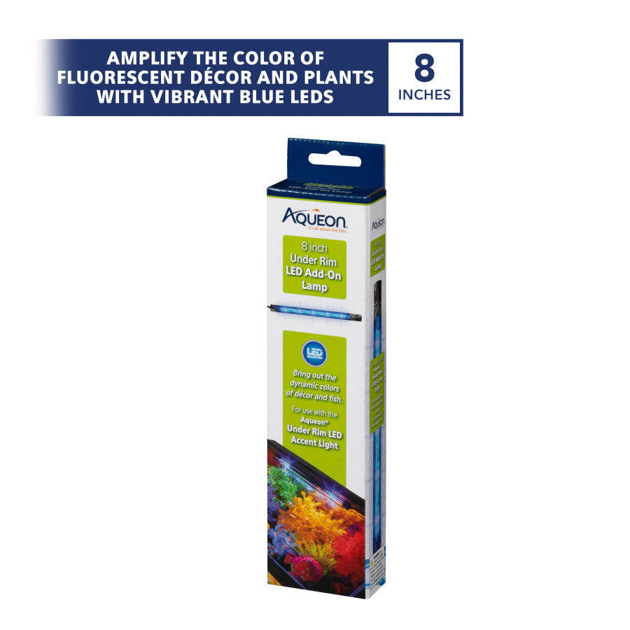 Aqueon® Under Rim Add-On Lamp enhances fluorescent décor, plants and fish. This 8-inch blue LED light connects includes a clamp that attaches to the inner rim of your framed aquarium. This lamp is an accessory and must be used with the Aqueon® Under Rim LED Accent Lamp to operate (sold separately).