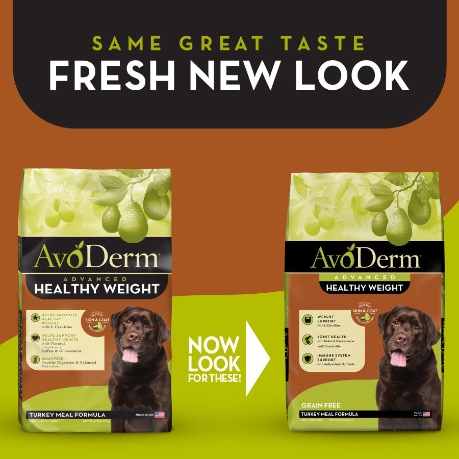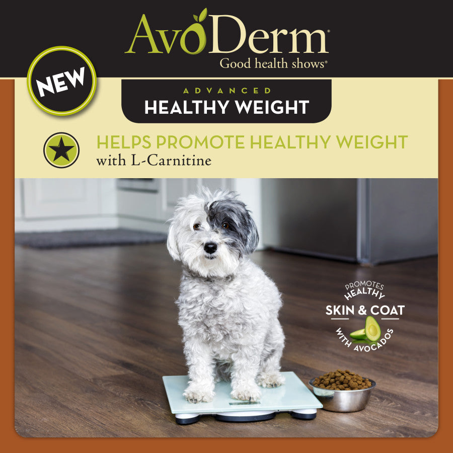 Keeping your dog healthy also includes maintaining a healthy weight. AvoDerm Advanced Healthy Weight dry dog food provides the necessary ingredients to keep your dog healthy and happy while helping them lose weight. Our secret? Simple, the weight management recipe contains 25% less fat than our leading AvoDerm Original Chicken Meal & Brown Rice adult dog food while providing a great taste. Serve up our Advanced Healthy Weight adult dog food and see the results. Our specialty grain free weight management formula is crafted for adult dogs that are less active or need to shed a few pounds. AvoDerm Natural dog food provides essential proteins to help your dog maintain their quality of life, even as they lose weight. It’s also made with L-Carnitine, a compound that helps break down fat, and natural chondroitin sulfate and glucosamine to help maintain healthy joints and support activities that maintain a healthy weight. We top off this premium formula with omega-rich avocados. These nutrient-dense superfoods help promote good health and healthy skin to keep your dog's coat shining all year long. Help your dog get to his optimal weight by serving up Advanced Healthy Weight dog food. With every bite of our reduced fat kibble, your dog will be on his way to a healthier life. Our adult dry food is pressure cooked to ensure your dog receives the optimum nutrition from the high-quality ingredients. This includes vitamins, minerals, and antioxidant nutrients to help support your dog's immune function and health. Feel confident when feeding your dog AvoDerm Natural. Our formulas never include meat by-products, artificial flavors or artificial colors. Serve your dog AvoDerm Natural regularly to sustain the highest level of nutrition while maintaining a healthy weight. Deliver all the great taste they crave and all the nutrition they need with less of the fat.