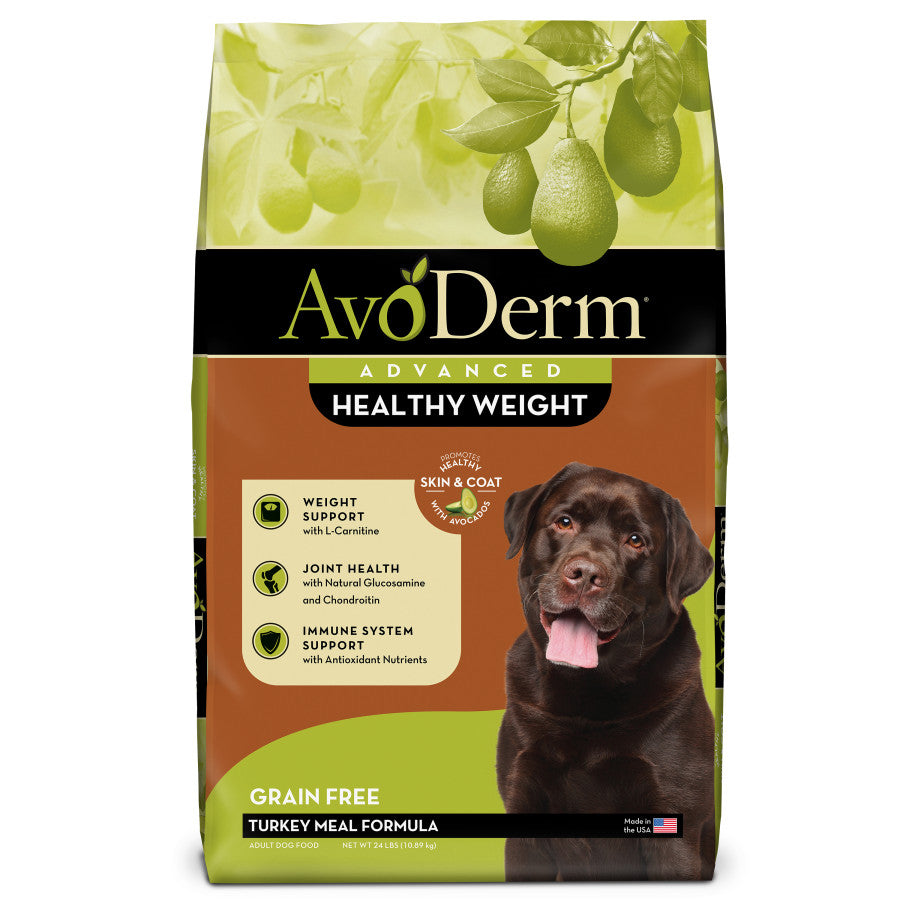 Keeping your dog healthy also includes maintaining a healthy weight. AvoDerm Advanced Healthy Weight dry dog food provides the necessary ingredients to keep your dog healthy and happy while helping them lose weight. Our secret? Simple, the weight management recipe contains 25% less fat than our leading AvoDerm Original Chicken Meal & Brown Rice adult dog food while providing a great taste. Serve up our Advanced Healthy Weight adult dog food and see the results. Our specialty grain free weight management formula is crafted for adult dogs that are less active or need to shed a few pounds. AvoDerm Natural dog food provides essential proteins to help your dog maintain their quality of life, even as they lose weight. It’s also made with L-Carnitine, a compound that helps break down fat, and natural chondroitin sulfate and glucosamine to help maintain healthy joints and support activities that maintain a healthy weight. We top off this premium formula with omega-rich avocados. These nutrient-dense superfoods help promote good health and healthy skin to keep your dog's coat shining all year long. Help your dog get to his optimal weight by serving up Advanced Healthy Weight dog food. With every bite of our reduced fat kibble, your dog will be on his way to a healthier life. Our adult dry food is pressure cooked to ensure your dog receives the optimum nutrition from the high-quality ingredients. This includes vitamins, minerals, and antioxidant nutrients to help support your dog's immune function and health. Feel confident when feeding your dog AvoDerm Natural. Our formulas never include meat by-products, artificial flavors or artificial colors. Serve your dog AvoDerm Natural regularly to sustain the highest level of nutrition while maintaining a healthy weight. Deliver all the great taste they crave and all the nutrition they need with less of the fat.