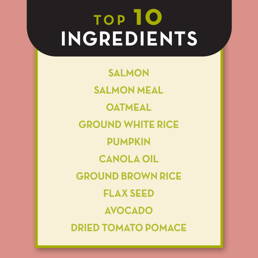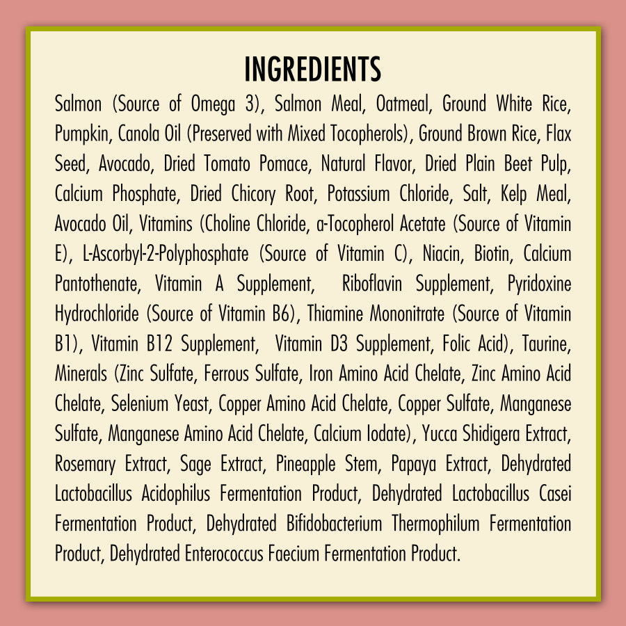 - Ingredients: Salmon (Source of Omega 3), Salmon Meal, Oatmeal, Ground White Rice, Pumpkin, Canola Oil (Preserved with Mixed Tocopherols), Ground Brown Rice, Flax Seed, Avocado, Dried Tomato Pomace, Natural Flavor, Dried Plain Beet Pulp, Calcium Phosphate, Dried Chicory Root, Potassium Chloride, Salt, Kelp Meal, Avocado Oil, Vitamins (Choline Chloride, a-Tocopherol Acetate (Source of Vitamin E), L- Ascorbyl-2-Polyphosphate (Source of Vitamin C), Niacin, Biotin, Calcium Pantothenate, Vitamin A Supplement, Riboflavin Supplement, Pyridoxine Hydrochloride (Source of Vitamin B6), Thiamine Mononitrate (Source of Vitamin B1), Vitamin B12 Supplement, Vitamin D3 Supplement, Folic Acid), Taurine, Minerals (Zinc Sulfate, Ferrous Sulfate, Iron Amino Acid Chelate, Zinc Amino Acid Chelate, Selenium Yeast, Copper Amino Acid Chelate, Copper Sulfate, Manganese Sulfate, Manganese Amino Acid Chelate, Calcium Iodate), Yucca Shidigera Extract, Rosemary Extract, Sage Extract, Pineapple Stem, Papaya Extract, Dehydrated Lactobacillus Acidophilus Fermentation Product, Dehydrated Lactobacillus Casei Fermentation Product, Dehydrated Bifidobacterium Thermophilum