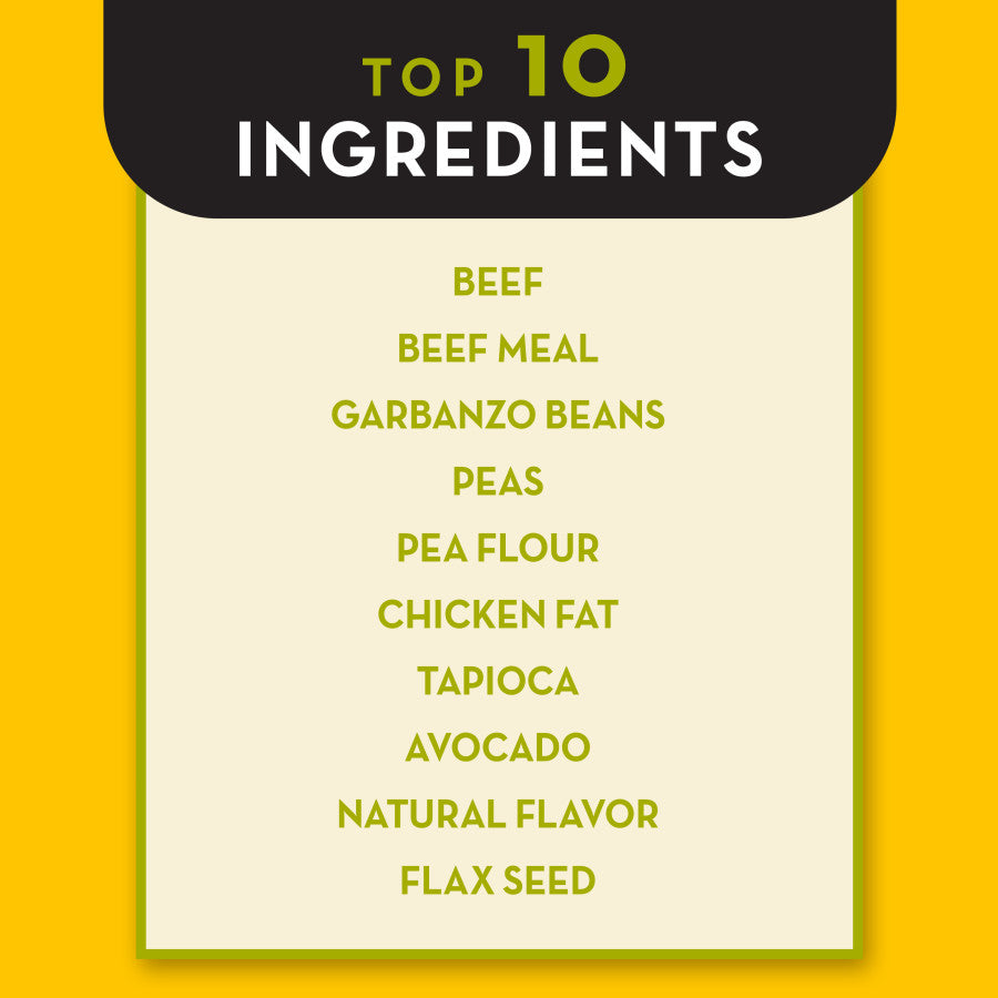 - Ingredients: Beef, Beef Meal, Garbanzo Beans, Peas, Pea Flour, Chicken Fat (Preserved with Mixed Tocopherols), Tapioca, Avocado, Natural Flavor, Flax Seed (Source of Omega 3), Pea Fiber, Dried Chicory Root, Potassium Chloride, Salt, Kelp Meal, Avocado Oil, Vitamins (Choline Chloride, a-Tocopherol Acetate (Source of Vitamin E), L-Ascorbyl-2-Polyphosphate (Source of Vitamin C), Niacin, Biotin, Calcium Pantothenate, Vitamin A Supplement, Riboflavin Supplement, Pyridoxine Hydrochloride (Source of Vitamin B6), Thiamine Mononitrate (Source of Vitamin B1), Vitamin B12 Supplement, Vitamin D3 Supplement, Folic Acid), Taurine, Minerals (Zinc Sulfate, Ferrous Sulfate, Iron Amino Acid Chelate, Zinc Amino Acid Chelate, Selenium Yeast, Copper Amino Acid Chelate, Copper Sulfate, Manganese Sulfate, Manganese Amino Acid Chelate, Calcium Iodate), Yucca Shidigera Extract, Rosemary Extract, Sage Extract, Pineapple Stem, Papaya Extract, Dehydrated Lactobacillus Acidophilus Fermentation Product, Dehydrated Lactobacillus Casei Fermentation Product, Dehydrated Bifidobacterium Thermophilum Fermentation Product, Dehydrated Enterococcus Faecium Fermentation Product.