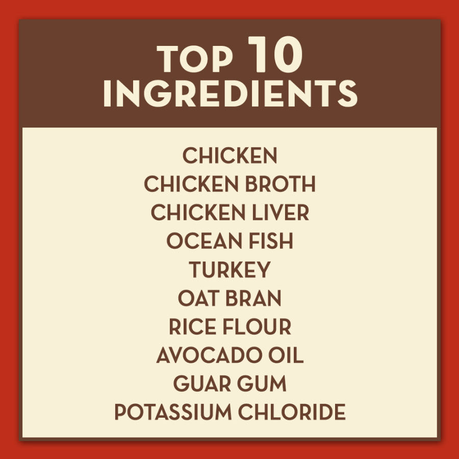 - Ingredients: Chicken, Chicken Broth, Chicken Liver, Ocean Fish (Source Of Omega 3), Turkey, Oat Bran, Rice, Avocado Oil, Guar Gum, Potassium Chloride, Vitamins (Thiamine Mononitrate, Vitamin E Supplement, Niacin Supplement, D-Calcium Pantothenate, Pyridoxine Hydrochloride, Riboflavin Supplement, Vitamin A Supplement, Biotin, Vitamin D3 Supplement, Vitamin B12 Supplement, Folic Acid), Cassia Gum, Xanthan Gum, Taurine, Minerals (Ferrous Sulfate, Zinc Oxide, Copper Proteinate, Potassium Iodide, Manganese Sulfate, Sodium Selenite), Choline Chloride, Salt.