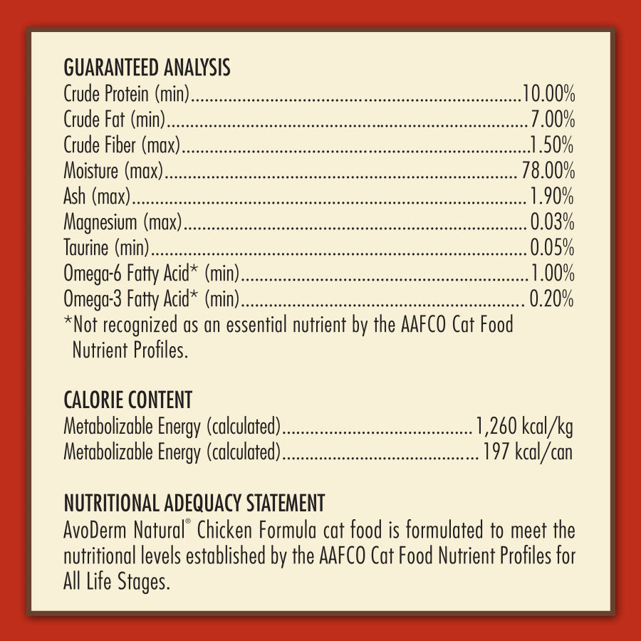 Serve a mouthwatering entree your cat will look forward to everyday during meal time. AvoDerm Chicken Entree Wet Cat Food only contains premium ingredients that are fit for all life stages, including kittens and adult cats. Specially crafted with your kitten in mind, AvoDerm Natural cat food recipes include carefully selected ingredients to appeal to even the pickiest of cats. You can rest assured knowing our wet canned cat food is providing nothing but natural and high-quality ingredients. AvoDerm Natural was created for the complete health of your cat. We begin our wet cat food formula with real chicken that provides a soft delicate texture they can easily sink their teeth into. Real chicken provides the delicious taste of poultry your cat desires while providing the necessary protein they need. Added vitamins, minerals and antioxidants help support your cat's immune function and overall well being. These ingredients are then complimented with omega-rich avocados. The nutrient dense superfoods help promote good health and healthy skin to keep your cat's coat shining all season long. The right nutrients in the right proportions are indispensable to keeping your cat's skin healthy. Best of all, AvoDerm Natural chicken cat food cans are formulated without soy, corn or wheat. Our formulas are made with no by-products meals, no artificial flavors and no artificial colors. Please your cat with the premium wet cat food she deserves without compromising the taste or nutrition. Feed AvoDerm Natural regularly to sustain the highest level of nutrition for your cat from the inside out.
