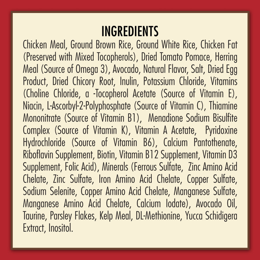 - Ingredients: Chicken Meal, Ground Brown Rice, Ground White Rice, Chicken Fat (Preserved with Mixed Tocopherols), Dried Tomato Pomace, Herring Meal (Source of Omega 3), Avocado, Natural Flavor, Salt, Dried Egg Product, Dried Chicory Root, Inulin, Potassium Chloride, Vitamins (Choline Chloride, a -Tocopherol Acetate (Source of Vitamin E), Niacin, L-Ascorbyl-2-Polyphosphate (Source of Vitamin C), Thiamine Mononitrate (Source of Vitamin B1), Menadione Sodium Bisulfite Complex (Source of Vitamin K), Vitamin A Acetate, Pyridoxine Hydrochloride (Source of Vitamin B6), Calcium Pantothenate, Riboflavin Supplement, Biotin, Vitamin B12 Supplement, Vitamin D3 Supplement, Folic Acid), Minerals (Ferrous Sulfate, Zinc Amino Acid Chelate, Zinc Sulfate, Iron Amino Acid Chelate, Copper Sulfate, Sodium Selenite, Copper Amino Acid Chelate, Manganese Sulfate, Manganese Amino Acid Chelate, Calcium Iodate), Avocado Oil, Taurine, Parsley Flakes, Kelp Meal, DL-Methionine, Yucca Schidigera Extract, Inositol