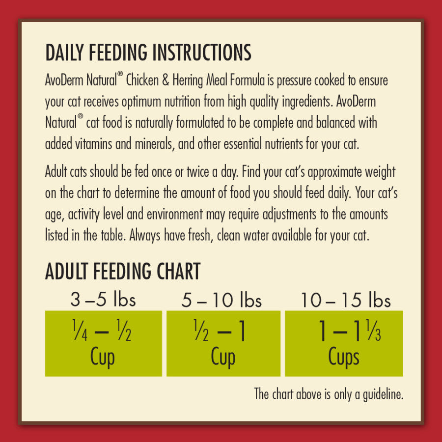 - Feeding Amount: Adult Feeding Chart3-5lbs: 1/4 to 1/2 cup 5-10lbs: 1/2 to 1 cup10-15lbs: 1 to 1 1/3 cupsKITTENSStart allowing kittens access to AvoDerm® Chicken & Herring Meal Formula cat food about 3 weeks before weaning. The food can be moistened to help consumption. After weaning feed the kitten 3 to 4 times per day for the first 2 months, and then from 2 to 3 times per day until reaching adult size, and then 1 to 2 times per day. Expect to feed 1 1/2 to 2 times the adult feeding recommendation during the kitten's growing phase. Adjust the daily amount fed so the kitten maintains a good body condition.PREGNANT FEMALESDuring pregnancy increase the feeding amount during the last 1/3 of pregnancy to 1 1/2 times the amount recommended as shown for the adult. Avoid excessive overfeeding, maintaining a good body condition, while preparing for whelp and nursing.LACTATING FEMALESA nursing female can expect to need 2 to 3 times as much food as recommended in the adult feeding guideline. Adjust the extra food given by the number of kittens and length of nursing. Try to maintain a good body condition. However, with large numbers of kittens, expect to have some loss in body fat for milk production.