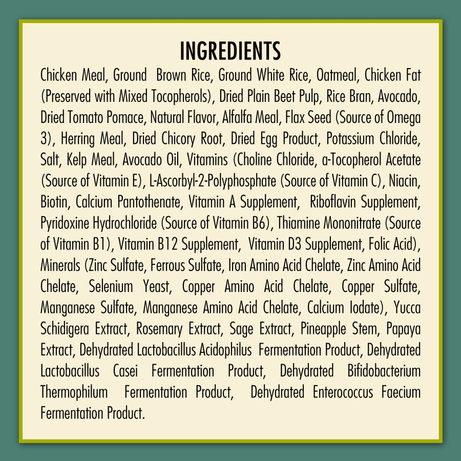 - Ingredients: Chicken Meal, Ground Brown Rice, Ground White Rice, Oatmeal, Chicken Fat (Preserved with Mixed Tocopherols), Dried Plain Beet Pulp, Rice Bran, Avocado, Dried Tomato Pomace, Natural Flavor, Alfalfa Meal, Flax Seed (Source of Omega-3 Fatty Acid), Dried Chicory Root, Dried Egg Product, Potassium Chloride, Salt, Kelp Meal, Vitamins (Choline Chloride, a-Tocopherol Acetate (Source of Vitamin E), L-Ascorbyl-2-Polyphosphate (Source of Vitamin C), Biotin, Niacin, Calcium Pantothenate, Vitamin A Supplement, Riboflavin Supplement, Thiamine Mononitrate (Source of Vitamin B1), Vitamin B12 Supplement, Pyridoxine Hydrochloride (Source of Vitamin B6), Vitamin D3 Supplement, Folic Acid), Minerals (Zinc Sulfate, Ferrous Sulfate, Iron Amino Acid Chelate, Zinc Amino Acid Chelate, Selenium Yeast, Copper Amino Acid Chelate, Copper Sulfate, Manganese Sulfate, Manganese Amino Acid Chelate, Calcium Iodate), Avocado Oil, Yucca Schidigera Extract, Rosemary Extract, Sage Extract, Pineapple Stem (Source of Bromelain), Papain, Dehydrated Lactobacillus Acidophilus Fermentation Product, Dehydrated Lactobacillus Casei Fermentation Product, Dehydrated Bifidobacterium Thermophilum Fermentation Product, Dehydrated Enterococcus Faecium Fermentation Product.