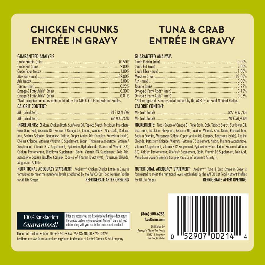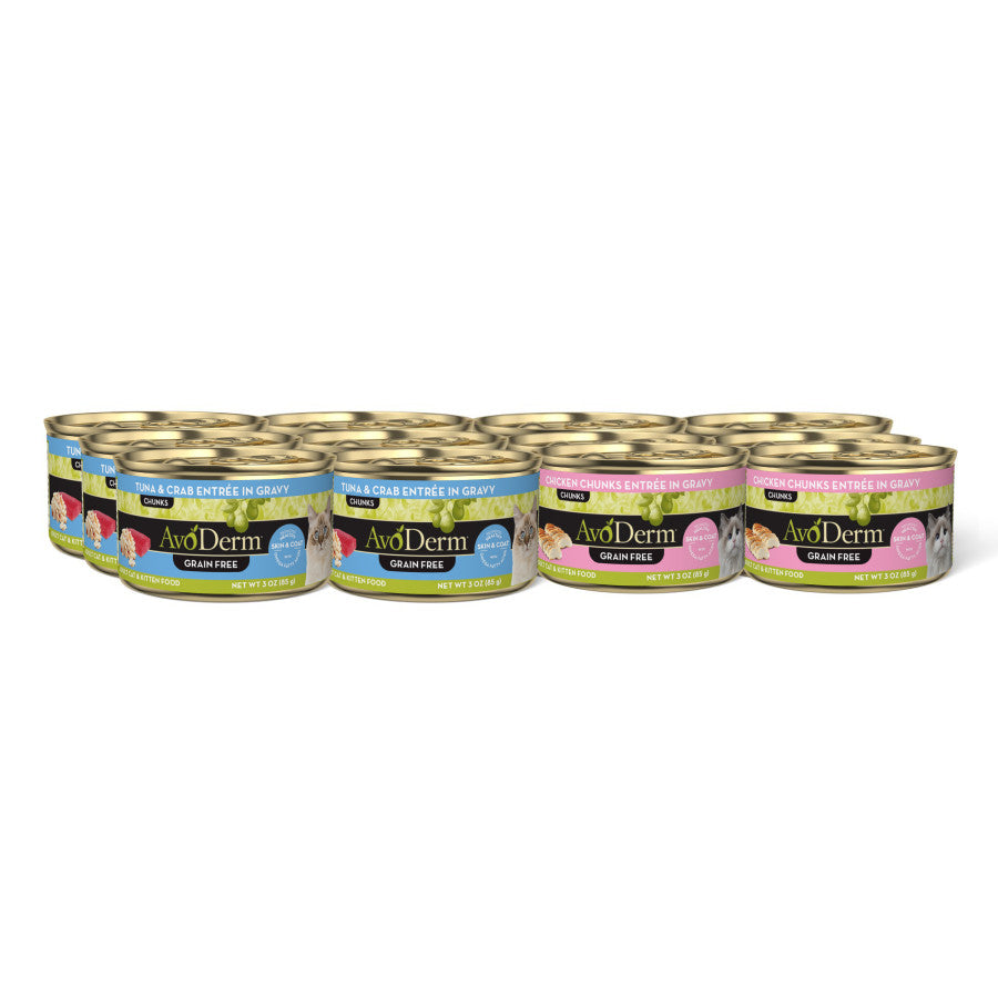 - AvoDerm Feline Favorites Canned Wet Cat Food Variety Pack 12ct: Six 3oz cans Chicken Chunks Entrée in Gravy Canned Wet Cat Food + Six 3oz cans Grain Free Tuna & Crab Entrée in Gravy Canned Wet Cat Food