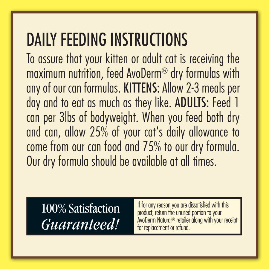 - Feeding Instructions: To assure that your kitten or adult cat is receiving the maximum nutrition, feed AvoDerm® dry formulas with any of our can formulas. KITTENS: Allow 2-3 meals per day and to eat as much as they like. ADULTS: Feed 1 can per 3lbs of bodyweight. When you feed both dry and can, allow 25% of your cat's daily allowance to come from our can food and 75% to our dry formula. Our dry formula should be available at all times.