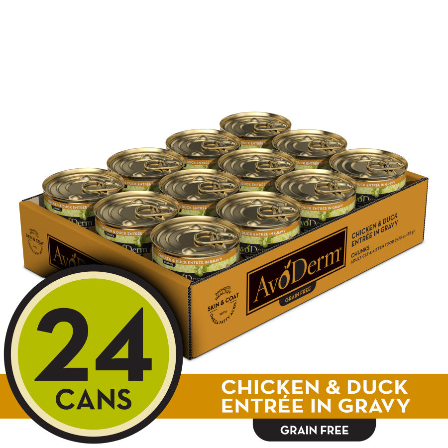 AvoDerm® Chicken & Duck Entrée in Gravy is grain-free and made with high-quality proteins providing healthy balanced nutrition for your cat. High-quality ingredients ensure that you are providing the optimum nutrition your pet needs. AvoDerm® was created for the complete health of your cat. Carefully formulated for the everyday health needs for today's cats, AvoDerm® starts with premium protein sources in delicious combinations to satisfy even the finicky cat. AvoDerm® has vitamins, minerals, and antioxidant nutrients to help support your cat's immune function. AvoDerm® is formulated to be rich in high-quality fats and oils with a balanced Omega-6 to Omega-3 fatty acid ratio. The right nutrients in the right proportions are indispensable to keeping your cat's skin healthy. Sometimes shortages or excesses of specific nutrients can lead to thin, rough coats. Avocado and avocado oil can help support the skin and coat from the inside out for the protection your pet needs. Feed AvoDerm® regularly to sustain the highest level of nutrition for your cat from the inside out.