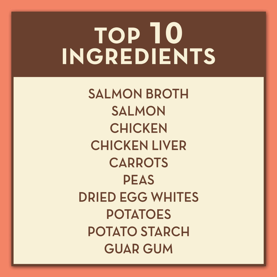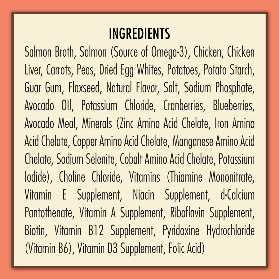 - Ingredients: Salmon Broth, Salmon (Source of Omega-3), Chicken, Chicken Liver, Carrots, Peas, Dried Egg Whites, Potatoes, Potato Starch, Guar Gum, Flaxseed, Natural Flavor, Salt, Sodium Phosphate, Avocado OIl, Potassium Chloride, Cranberries, Blueberries, Avocado Meal, Minerals (Zinc Amino Acid Chelate, Iron Amino Acid Chelate, Copper Amino Acid Chelate, Manganese Amino Acid Chelate, Sodium Selenite, Cobalt Amino Acid Chelate, Potassium Iodide), Choline Chloride, Vitamins (Thiamine Mononitrate, Vitamin E Supplement, Niacin Supplement, d-Calcium Pantothenate, Vitamin A Supplement, Riboflavin Supplement, Biotin, Vitamin B12 Supplement, Pyridoxine Hydrochloride (Vitamin B6), Vitamin D3 Supplement, Folic Acid)