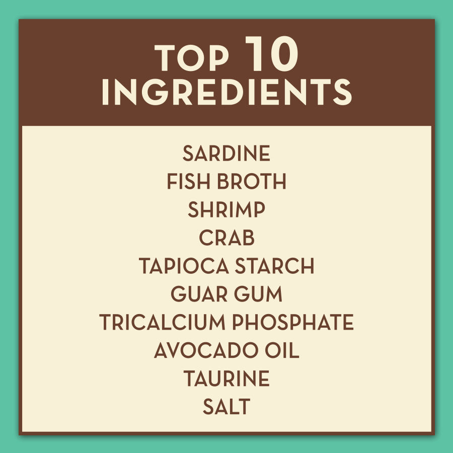 - Ingredients: Sardine (Source Of Omega 3), Fish Broth, Shrimp, Crab, Tapioca Starch, Guar Gum, Tricalcium Phosphate, Avocado Oil, Taurine, Salt, Minerals (Ferrous Sulfate Monohydrate, Zinc Oxide, Manganese Sulfate Monohydrate, Copper Amino Acid Complex, Sodium Selenite, Potassium Iodide), Potassium Chloride, Vitamins (Vitamin A Supplement, Vitamin D3 Supplement, Vitamin E Supplement, Thiamine Mononitrate, Niacin, Calcium Pantothenate, Riboflavin Supplement, Pyridoxine Hydrochloride (Vitamin B6), Folic Acid, Menadion Sodium Bisulfite Complex (Source Of Vitamin K Activity), Biotin, Vitamin B12 Supplement), Choline Chloride