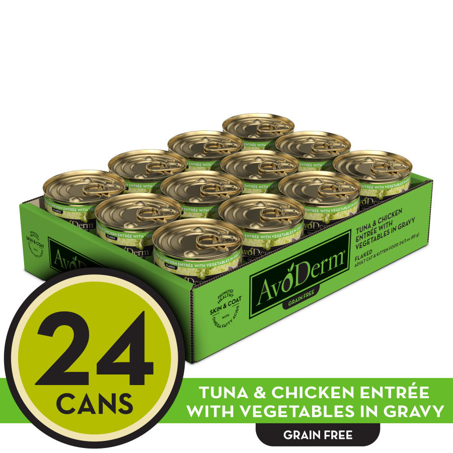 AvoDerm® Tuna & Chicken Entrée with Vegetables is grain free and made with high quality proteins providing healthy balanced nutrition for your cat. High quality ingredients ensure that you are providing the optimum nutrition your pet needs. AvoDerm® was created for the complete health of your cat. Carefully formulated for the everyday health needs for today's cats, AvoDerm® starts with premium protein sources in delicious combinations to satisfy even the finicky cat. AvoDerm® has vitamins, minerals, and antioxidant nutrients to help support your cat's immune function. AvoDerm® is formulated to be rich in high quality fats and oils with a balanced Omega-6 to Omega-3 fatty acid ratio. The right nutrients in the right proportions are indispensable to keeping your cat's skin healthy. Sometimes shortages or excesses of specific nutrients can lead to thin, rough coats. Avocado and avocado oil can help support the skin and coat from the inside out for the protection your pet needs. Feed AvoDerm® regularly to sustain the highest level of nutrition for your cat from the inside out.