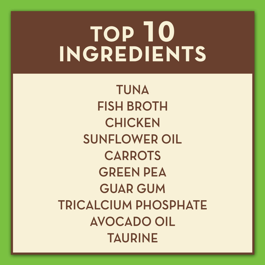 - Ingredients: Tuna (Source of Omega 3), Fish Broth, Chicken, Sunflower Oil, Carrots, Green Pea, Guar Gum, Tricalcium Phosphate, Avocado Oil, Taurine, Choline Chloride, Potassium Chloride, Minerals (Ferrous Sulfate Monohydrate, Zinc Oxide, Manganese Sulfate Monohydrate, Copper Amino Acid Complex, Sodium Selenite, Potassium Iodide), Vitamins (Vitamin A Supplement, Vitamin D3 Supplement, Vitamin E Supplement, Thiamine Mononitrate, Niacin, Calcium Pantothenate, Riboflavin Supplement, Pyridoxine Hydrochloride (Vitamin B6), Folic Acid, Menadion Sodium Bisulfite Complex (Source of Vitamin K Activity), Biotin, Vitamin B12 Supplement), Magnesium Oxide