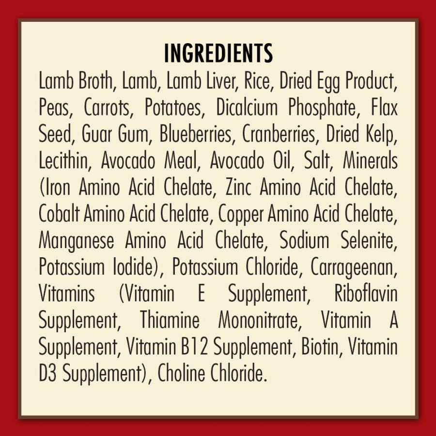 - Ingredients: Lamb Broth, Lamb, Lamb Liver, Rice, Potatoes, Carrots, Peas, Dried Egg Product, Avocado Oil, Tricalcium Phosphate, Flax Seed (Source of Omega 3), Guar Gum, Calcium Carbonate, Potassium Chloride, Salt, Blueberries, Cranberries, Dried Kelp, Lecithin, Avocado Powder, Cassia Gum, Xanthan Gum, Minerals (Zinc Amino Acid Chelate, Iron Amino Acid Chelate, Copper Amino Acid Chelate, Manganese Amino Acid Chelate, Sodium Selenite, Cobalt Amino Acid Chelate, Potassium Iodide), Vitamins (Thiamine Mononitrate, Vitamin E Supplement, Niacin Supplement, d-Calcium Pantothenate, Vitamin A Supplement, Riboflavin Supplement, Biotin, Vitamin B12 Supplement, Pyridoxine Hydrochloride, Vitamin D3 Supplement, Folic Acid), Choline Chloride