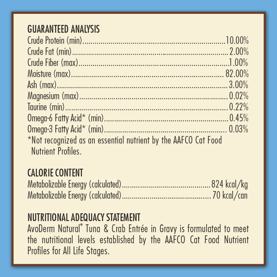 Your cat craves the taste of real meat during mealtime. Fill your cat's dish with AvoDerm Tuna & Crab Entree in Gravy wet cat food. Our formula starts with real tuna and crab which provides a delicious taste of seafood your cat desires while providing the necessary protein they need. Specially created with your cat in mind, AvoDerm Natural cat food recipes include carefully selected ingredients to appeal to even the pickiest of cats. You can rest assured knowing our grain-free canned cat food is providing nothing but natural and high-quality ingredients. AvoDerm Tuna & Crab Entree in Gravy is completely grain-free cat food for healthy digestion. High-quality proteins are chosen to provide healthy and balanced nutrition for your cat. These ingredients are also complimented with omega-rich avocados. Avocado and avocado oil can help support your cat's skin and coat from the inside out. With the help of additional vitamins, minerals, and antioxidants, our wet canned cat food provides the energy to support a healthy immune system and overall health. Feed your cat AvoDerm Natural regularly to sustain the highest level of nutrition. Rest assured knowing our Tuna and Crab formula is grain-free, corn-free, and soy-free. Additionally, the natural cat food recipes never include any artificial flavoring, artificial colors, or meat-by-products. Each canned cat food is crafted for all life stages, including adult cats and kittens. The simple ingredients make it highly digestible for cats, making it an excellent choice for cats with picky, sensitive stomachs. AvoDerm Natural grain-free wet cat food supplies optimum nutrition your pet needs so you can feel good about the food you serve them.