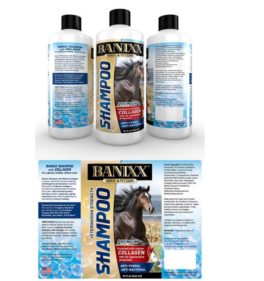 - Use Instructions: 1. Gently hose the affected area with plain water, then, apply a shampoo mix with a sponge. The mix should be 3-4 ounces of shampoo, diluted in a small water bucket (2 gallons). Leave the shampoo mix on your horse for at least 10 minutes so that it has time to work on the infection. Hose off and towel dry.2. For particularly tough areas, such as the front of the cannon bones shown on this page, apply shampoo directly onto a wet sponge and massage it into the legs. Legs must be wet first.3. Leave sudsy shampoo in place for at least 10 minutes. Repeat daily until required result is achieved.4. For Scratches and Rain Rot infections, the regular Banixx spray may be used to “finish” the process since it is a “leave-on’ application.