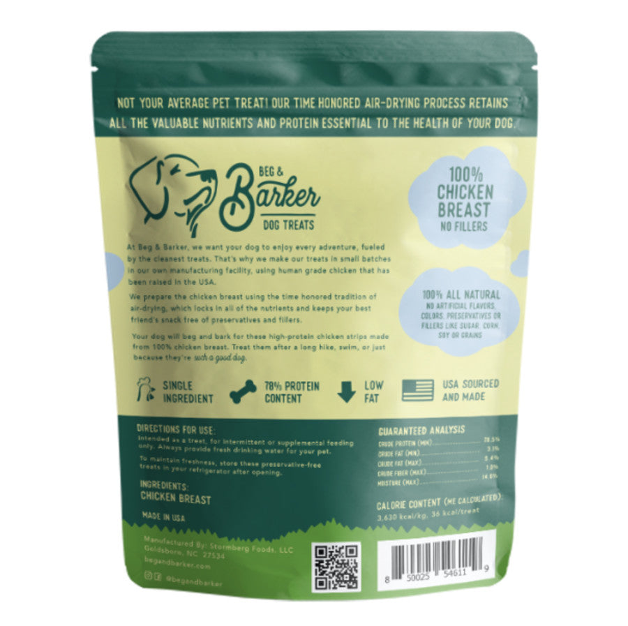 Beg & Barker’s Air-Dried All Natural Human Grade Chicken Breast Strip Treats are a premium Jerky-style free form strip of 100% whole human grade chicken breasts only sourced from and in the USA, air-dried to lock in the nutrients and flavors of the meat. No artificial fillers or empty promises. Just the commitment to fueling cleaner diets when used as a treat because a healthy dog is a happy dog. Pure meat sticks make the highest value treats which are high in protein and bioavailable nutrient benefits for dogs. Grain-Free, Sugar-Free, Corn-Free, Guilt-Free.