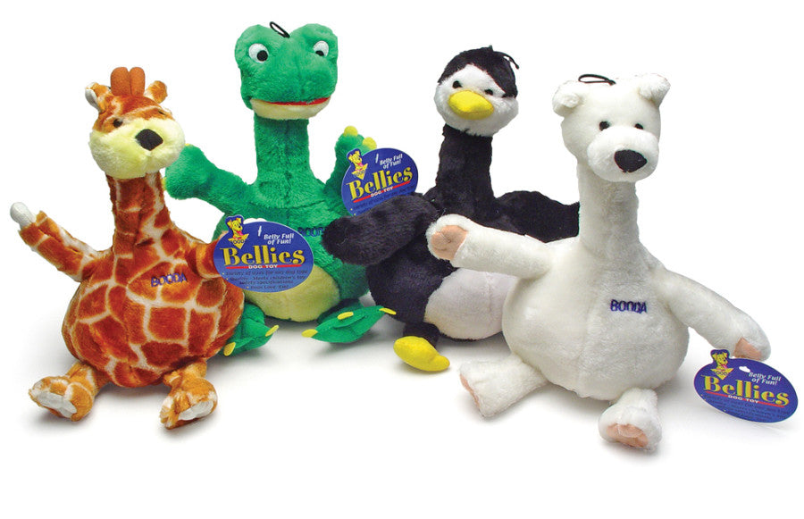 Booda® Bellies are irresistible plush toys that your dog will love to sink his teeth into! Each fun-loving character, including Giraffe and Polar Bear, features a big, squeezable belly that makes a loud grunting sound that will drive your dog crazy with excitement! Dimensions: 11 X 6 X 15