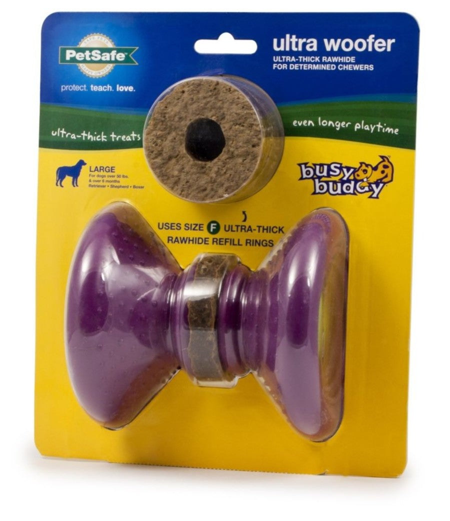 Dogs love to chew, and this toy is designed with determined chewers in mind. The extra-wide ends of the Woofer protect a single ultra-thick rawhide treat ring. The ring is 4 times thicker than our regular Busy Buddy rawhide rings. The toy design makes it more difficult for dogs to get a grip on the rawhide. Testing has shown that Ultra toys will hold a dog's interest for 4 times as long as other Busy Buddy toys.