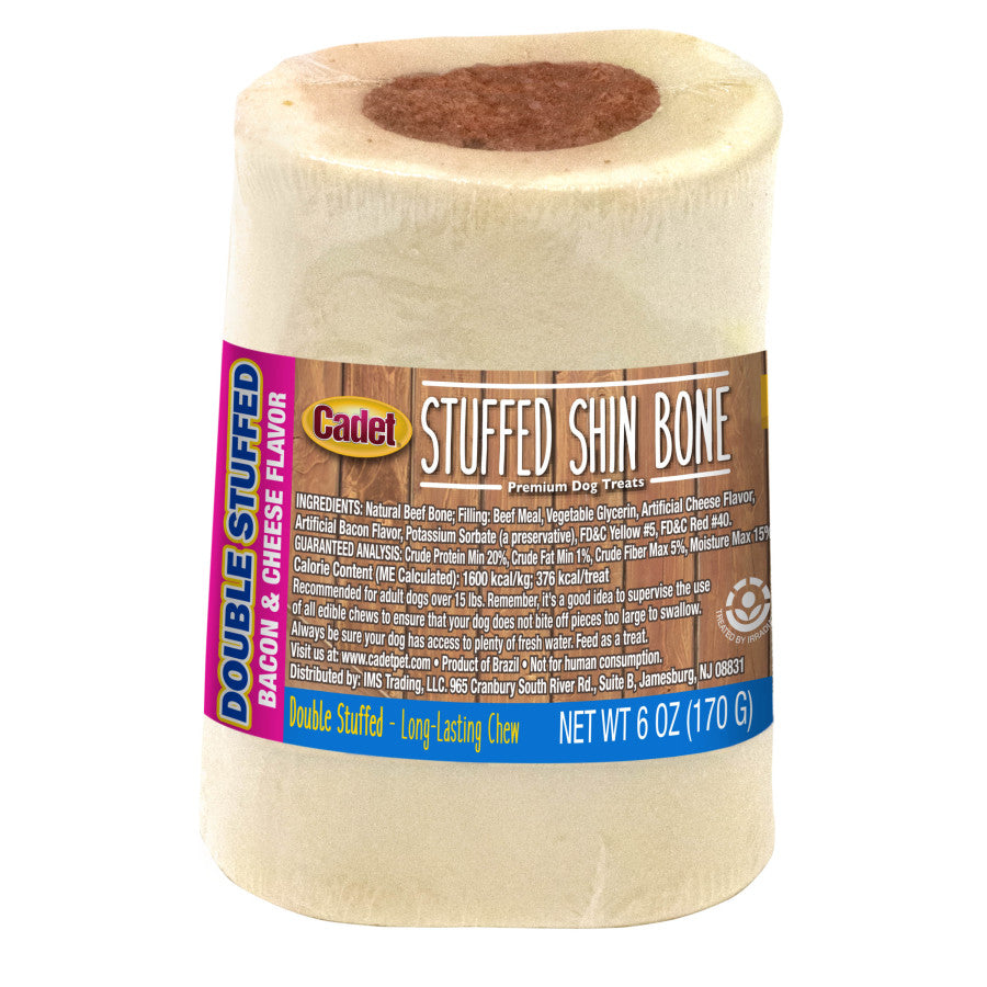 For over 30 years, Cadet has been providing healthy and delicious chews and treats that satisfy every dog's natural chewing instincts. Cadet Double Stuffed Shin Bones offer dogs DOUBLE the flavor for an irresistible chewing adventure! Made with a real beef bone, each natural dog chew is filled with delicious flavors. They help ease stress and curb your dog's urge to chew without chipping or breaking apart easily, making it perfect for aggressive chewers. Naturally cleaned for safer chewing, these dog bones help support dental health by reducing plaque and tartar buildup as dogs chew. Refill the beef shin bones for dogs with your Cadet's favorite spread to keep the fun going!