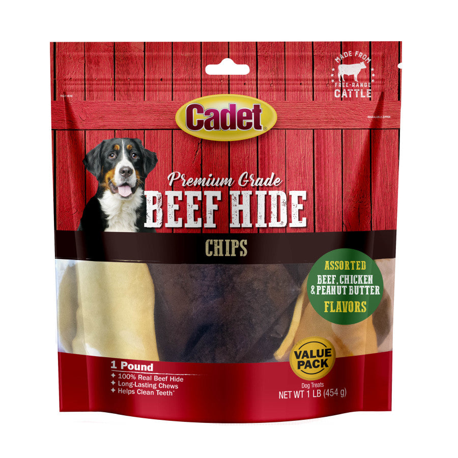 For over 30 years, Cadet has been providing naturally delicious chews and treats for dogs. Cadet Beef Hide Chips are premium-grade, irresistible chews. Made with 100% real beef hide sourced from the finest-quality cattle, these natural dog chews are tasty rewards to give your best friend. Each long lasting beef hide chip will keep your dog occupied and help discourage destructive chewing. Plus, they naturally promote healthy teeth and gums by reducing plaque and tartar buildup as dogs chew. Treat your Cadet to these beef dog chews for enjoyment that lasts!