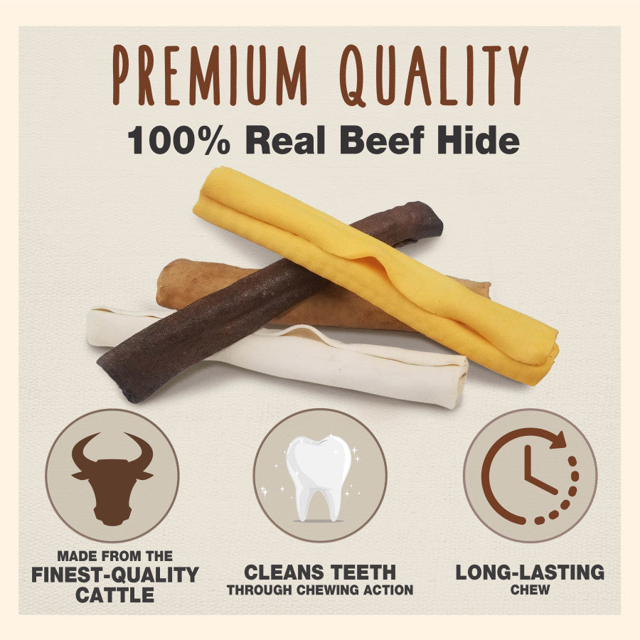 - Rawhide rolls made with premium-quality beef hide for a chew you can give with confidence