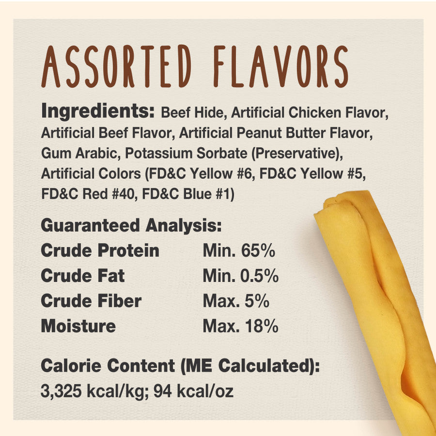 - Ingredients: Beef Hide, Artificial Chicken Flavor, Artificial Beef Flavor, Artificial Peanut Butter Flavor, Gum Arabic, Potassium Sorbate (Preservative), Artificial Colors (FD&C Yellow #5, FD&C Red #40, FD&C Blue #1)