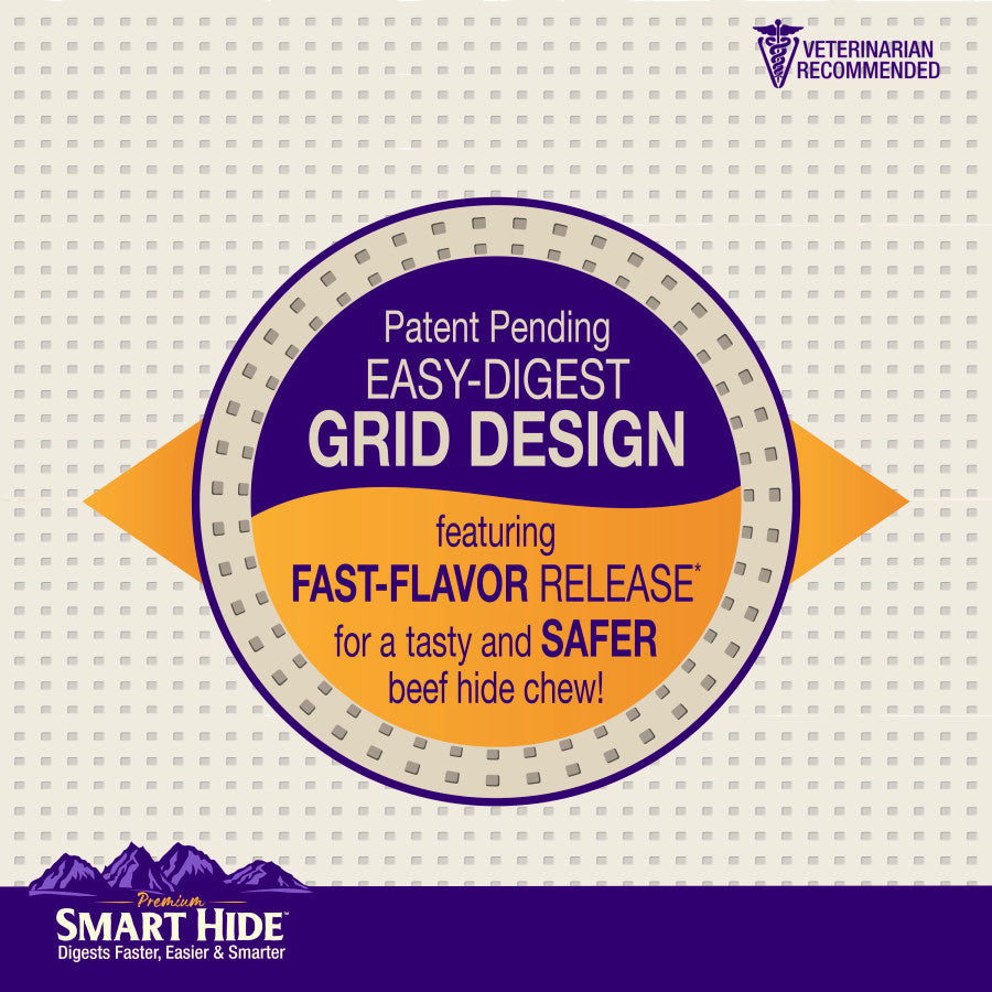 Go above and beyond for your dog's safety and happiness with Cadet Smart Hide Knotted Bones! This veterinarian-recommended rawhide chew features a patent-pending Easy-Digest Grid Design, which uses breakthrough technology to strategically place holes throughout the beef hide. These small holes help the chew soften faster and digest easier in dogs’ stomachs compared to standard rawhide chews. In fact, this all-natural, premium rawhide chew is more than 90% digestible! In addition to easier digestion, the grid design also features Fast-Flavor Release for the ultimate tasty satisfaction. As your dog chews, the holes create more accessible areas for extra savory flavor to discover! Better yet, this long lasting dog chew helps clean teeth through mechanical chewing action for happier, healthier smiles!