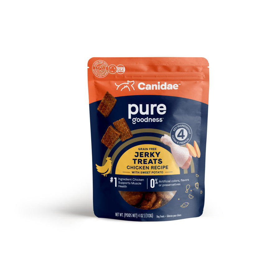 For a wholesome treat that's packed with good nutrition and flavor, try CANIDAE PURE Chicken & Sweet Potato Recipe Jerky Dog Treats! These high-protein jerky bites are made from high-quality ingredients for a taste dogs can't resist. Real chicken provides protein to support strong muscles, while sweet potatoes promote healthy digestion. Plus, there's only one animal protein in these treats, so they're paw-fect for dogs with sensitive stomachs. Happy snacking!