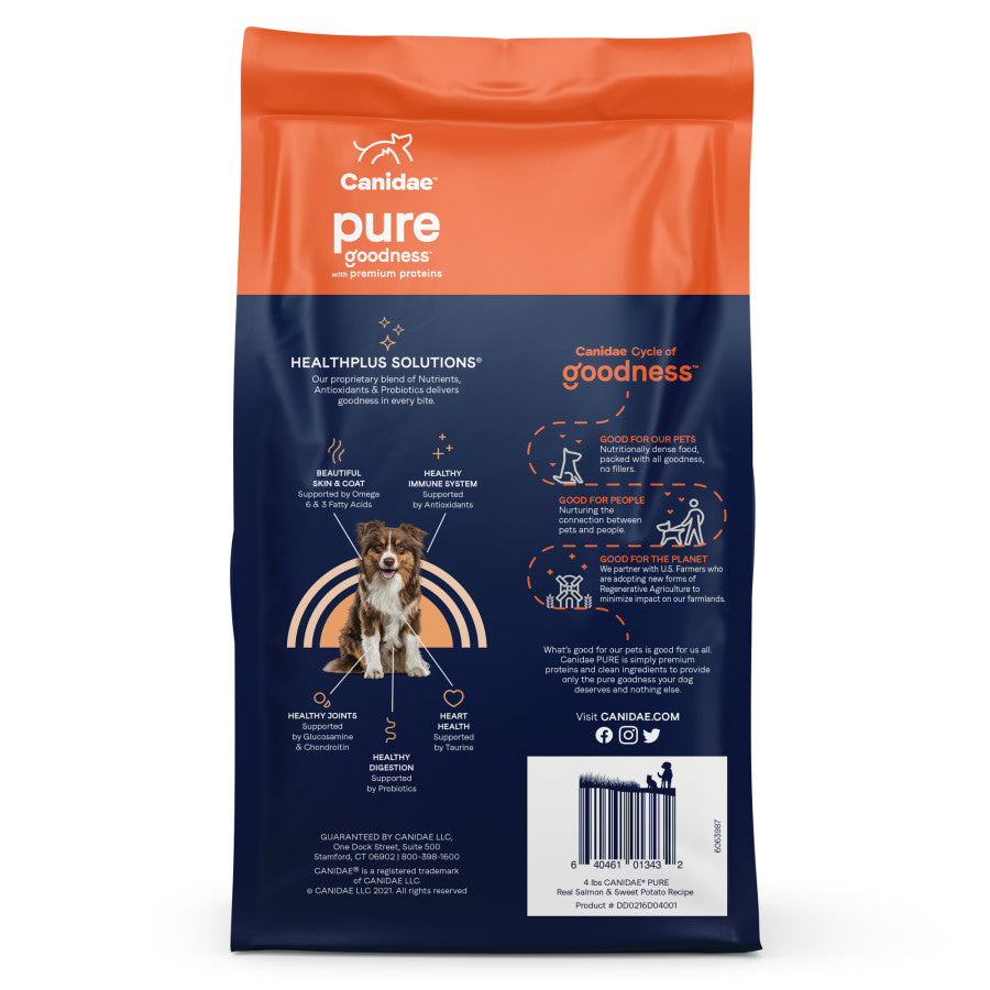 Canidae PURE features premium proteins and clean recipes using a limited number of wholesome ingredients that are easily recognizable. These limited ingredient formulas offer your dog a well-rounded meal that’s been crafted with their health and well-being in mind. Choose from a variety of formulas made with premium proteins like bison, wild boar, duck or salmon, paired with whole ingredients like sweet potatoes, peas, lentils, or chickpeas — never corn, wheat, or soy. This grain-free dog food is ideal for pups with a sensitive stomach and offers nothing but pure goodness for your best friend. Canidae pet foods are ultra nutritionally dense, giving your pet the goodness they deserve.