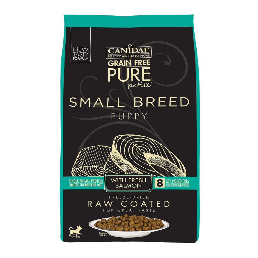 CANIDAE Grain Free PURE Petite formulas are made with 8 key ingredients for sensitive small dogs. We use real meat first and raw coat the kibble with freeze-dried meat for great-tasting nutrition that even the finickiest of small dogs is sure to love. We also add whole ingredients like peas, lentils, and garbanzo beans for gentle digestion-never corn, wheat or soy. Finicky small dogs will love the great taste and small kibble size-and you'll love the premium nutrition. Available in adult or puppy formulas.