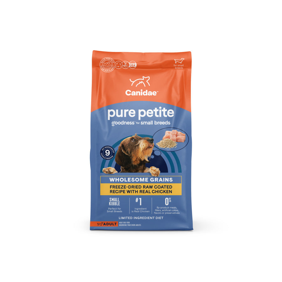 Canidae Pure Petite With Grains Limited Ingredient Dry Dog Food for Small Breeds with Chicken offers your small dog a well-rounded meal that's been crafted with their health and well-being in mind. The first ingredient in this limited ingredient dog food recipe is real chicken that is paired with whole ingredients, including wholesome grains like barley & oatmeal. Canidae Pure Petite dog food is made without corn, wheat or soy, making it ideal for small pups with sensitive stomachs. This freeze-dried dog food kibble is also raw coated with chicken for great tasting nutrition that even the finickiest of small dogs is sure to love. Formulated specifically for small adult dogs, this grain-inclusive dry dog food features a small kibble size that is perfect for petite dogs, along with antioxidants that help support their immune system and probiotics to support a healthy digestive system. With high quality, wholesome ingredients, Canidae Pure Petite small breed dry dog food gives your pet the goodness they deserve.