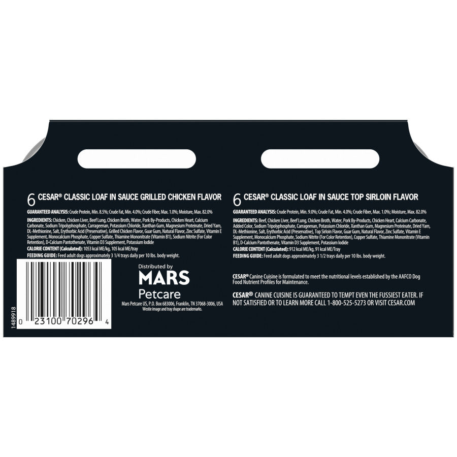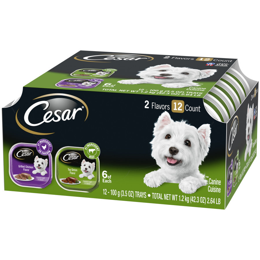 - Contains one (1) 12-count case of 3.5 oz. trays of CESAR Wet Dog Food Classic Loaf in Sauce Top Sirloin & Grilled Chicken Flavors Variety Pack: (6) Top Sirloin Flavor and (6) Grilled Chicken Flavor