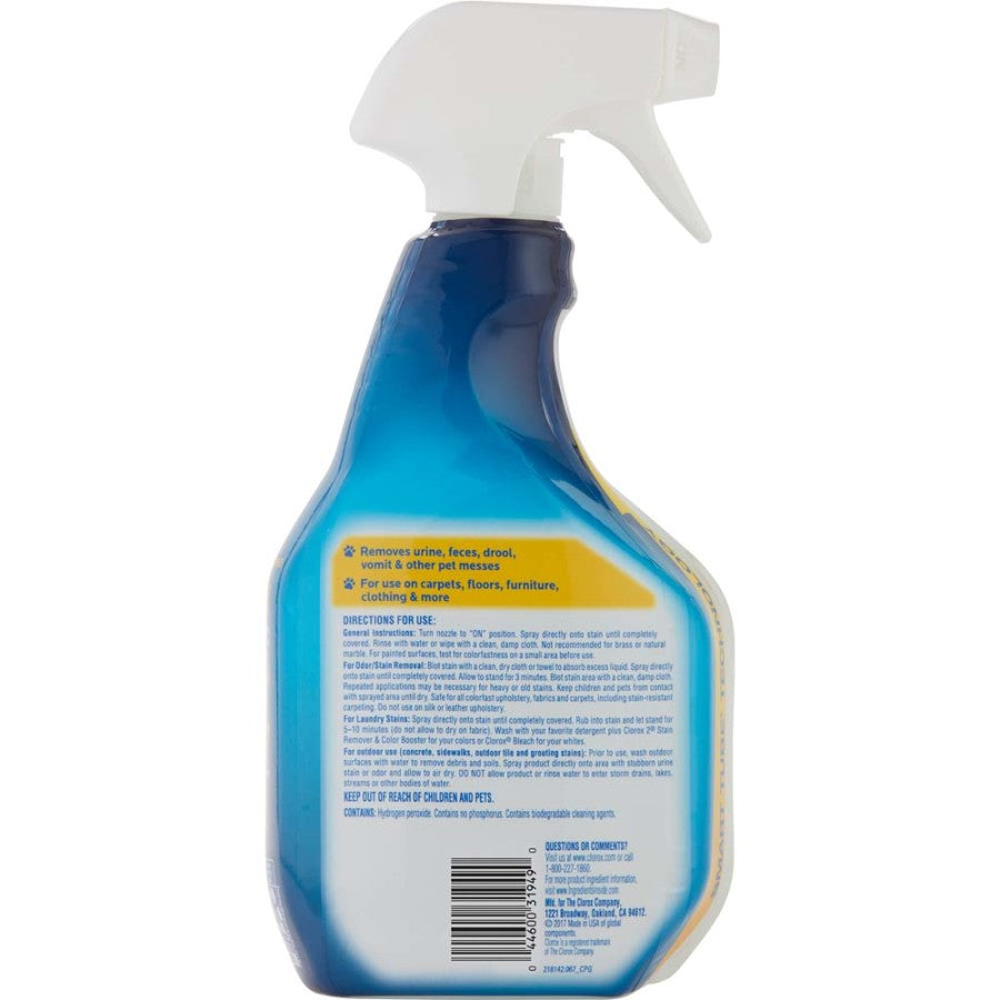 Tough on stains and odors, gentle on surfaces and safe around pets. The fast penetrating formula effectively cleans and removes a variety of pet messes including urine, feces, drool, vomit and other pet stains and accidents. This stain removal and odor eliminator is the pet solution for cleaning pet messes the first time. Tough on stains and odors, this spray is great for use on surfaces such as flooring, furniture, pet bedding, clothing, carpets, upholstery and travel crates. Keep your home fresh and odor free with the Clorox trusted clean. This bleach-free and fragrance-free formula. spray so that you can target the affected area for cleaning and discourage repeat marking.