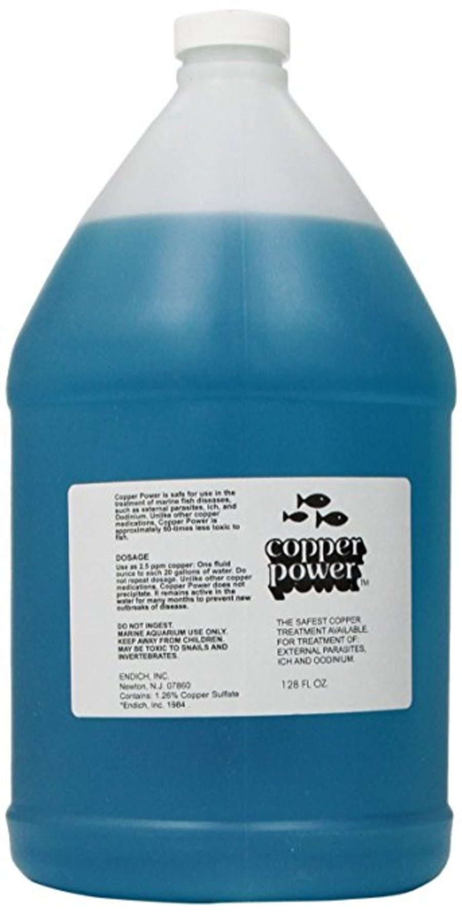 Copper Power Marine is one of the safest most effective copper medications available for the elimination of external parasites. Copper Power Marine is a Safe & Effective Copper Treatment for Marine fish. Used at 2.5 PPM Copper - nearly 5-Times the normal toxic level of copper in salt water. Copper Power's higher concentration lets you Blast away disease. COPPER POWER WILL NOT PRECIPITATE OUT OF THE WATER AND REMAINS ACTIVE IN THE WATER ACTING AS A PREVENTATIVE AGAINST NEW OUTBREAKS OF DISEASE.