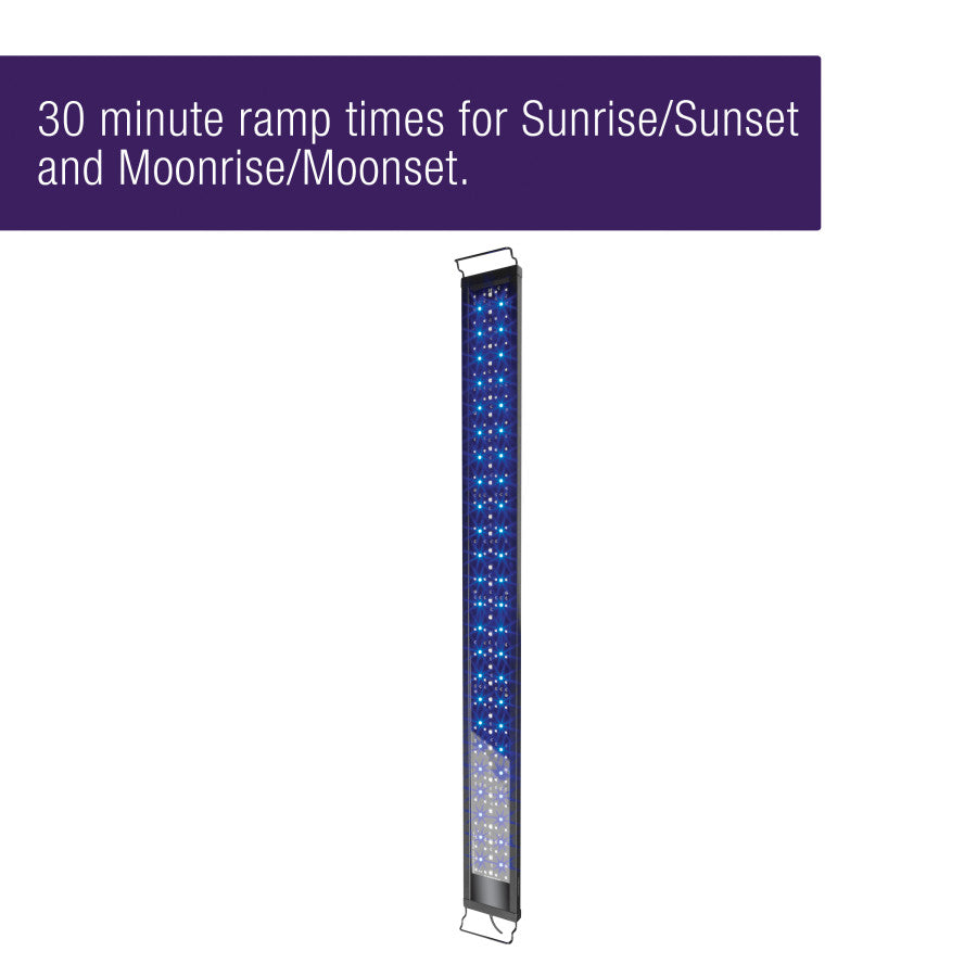 - Natural day cycle with 30-minute ramp times mimicking sunrise/sunset and moonrise/moonset