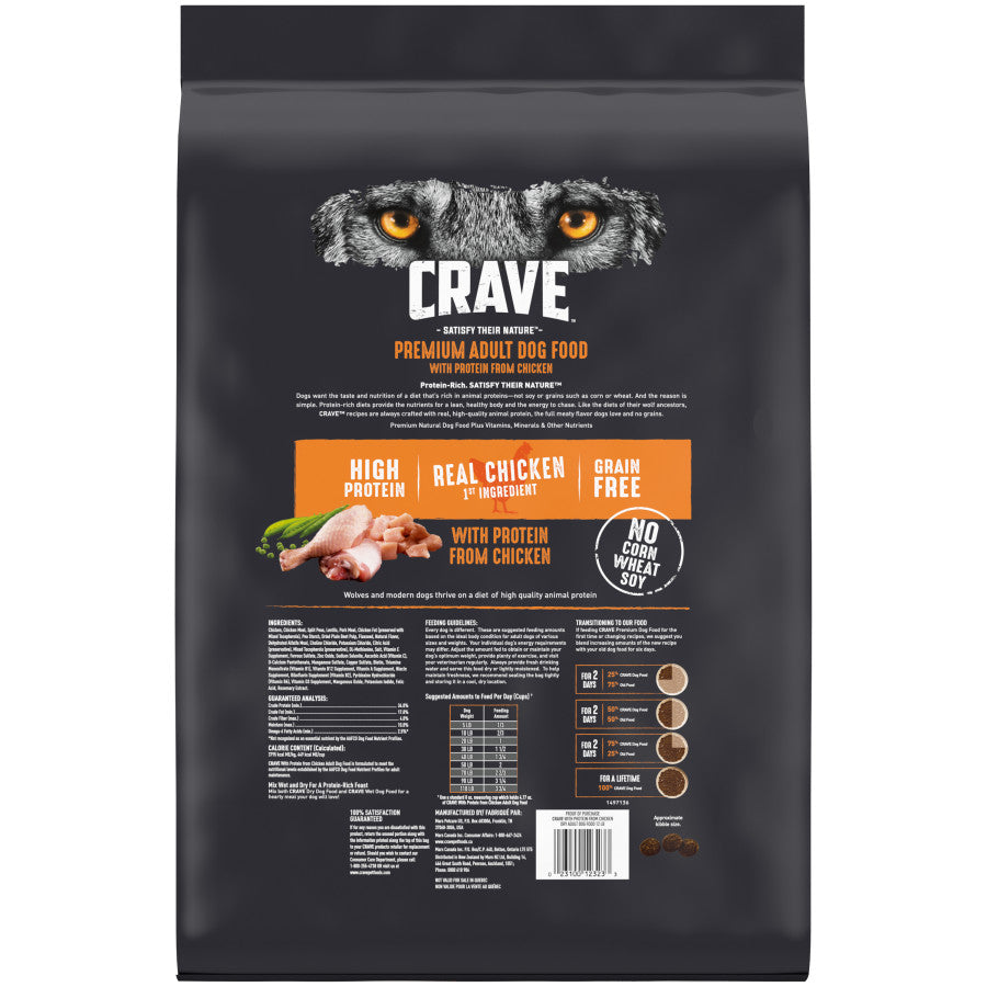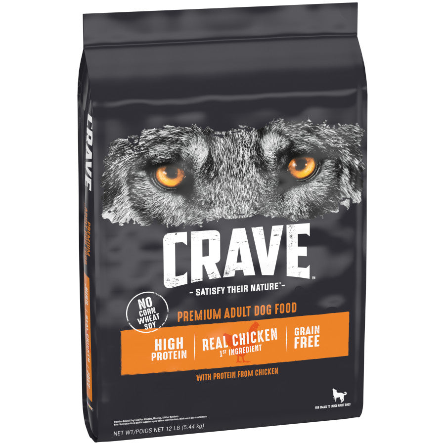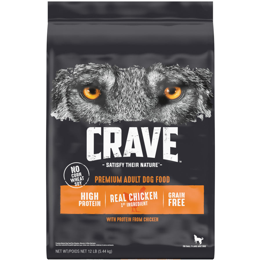 - Contains one (1) 12 lb. bag of CRAVE Grain Free Adult Dry Dog Food with Protein from Chicken—for any size dog