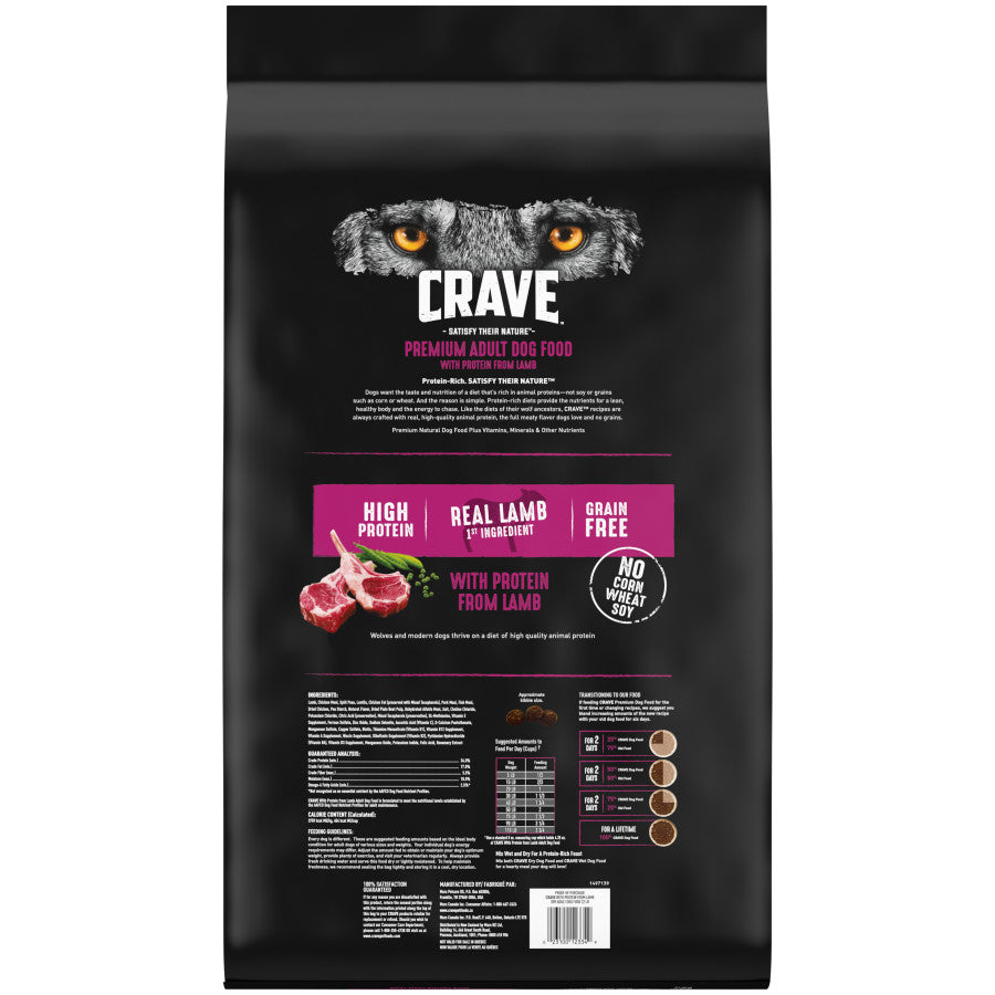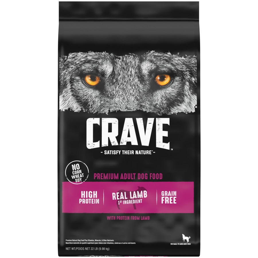 - Contains one (1) 22 lb. bag of CRAVE Grain Free Adult Dry Dog Food with Protein from Lamb —for any size dog