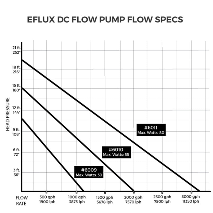 EFlux controllable DC water pumps efficiently produce strong water flow with high pressure. Featuring a sealed DC motor and magnetic drive design, EFlux water pumps can be used inline (external) or submersible in both marine and freshwater. Features include:- Sealed magnetic drive pump runs virtually silent- Adjustable flow rate from 0 to 100%- DC voltage - up to 65% energy savings- Feed Mode ñ idles pumps for 10 minutes during feeding- Communicates with LOOP network, providing active feedback on pump issues- IC electronic detection protects pump if no water is present- Fully adjustable dial control, upgradeable to Bluetooth Each EFlux DC water pump includes rubber mounting brackets, molded prefilter assembly, barbed inlet & outlet fittings, LOOP Pump Hub with flow dial control, 24VDC UL listed DC transformer and all connecting hardware. Maximum flow rate 1050 gph, maximum head pressure 10.5 ft, maximum watts 30.