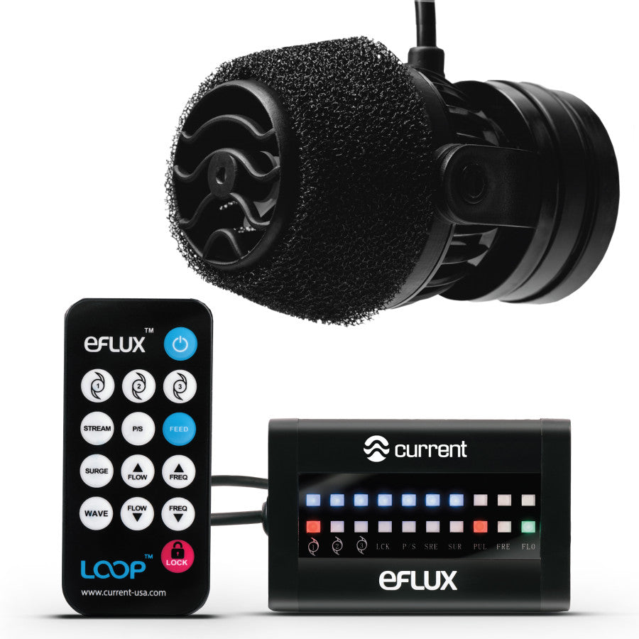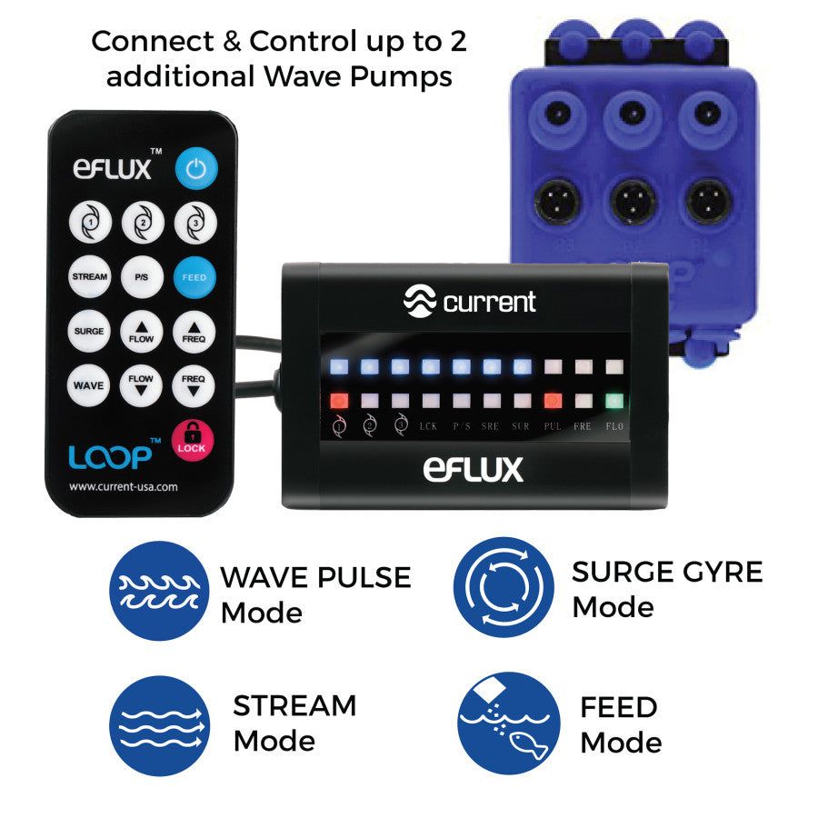 EFlux controllable wave pumps simulate water flow found in nature, providing tank wide circulation, improving water quality and promoting strong coral growth and fish health. Kits come with magnetic swivel bracket, foam cover, Wave Pump HUB (for up to 3 wave pumps), LED pump display with remote control, micro-USB & IR sensor cables, protective wire guard, HUB & LED display mounting clips, UL-Approved DC transformer and complete instructions. Features include:- Virtually silent, propeller style wave pump- Wireless control of flow speed and flow pattern- Easy magnetic swivel bracket assembly- Super safe, low DC voltage- Adjustable flow from 20% to 100%- Three flow modes: Stream, Surge, Wave- Additional Feed Mode shuts pumps off for feeding- Gyre mode synchronizes two pumps for gyre flow- Includes infrared control, upgradeable to Bluetooth Flux DC Controllable Wave Pump Kit includes a super quiet 660gph propeller wave pump, magnet attachment assembly with swivel bracket, foam filter, LOOP Pump HUB for connecting up to 2 additional wave pumps, LED pump display, IR remote controller, DC power supply and all connecting hardware.